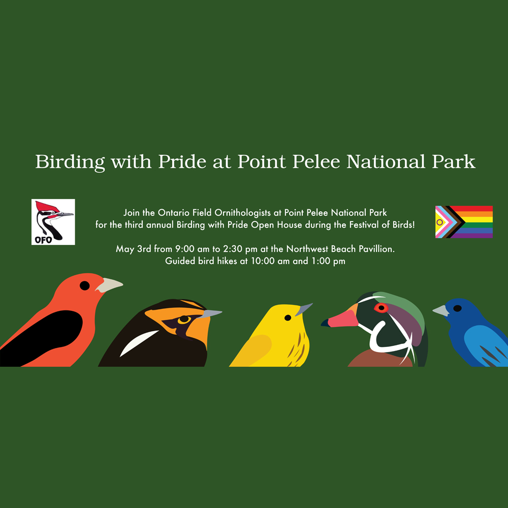 Join the Ontario Field Ornithologists (OFO) at Point Pelee National Park on May 3rd for our annual Birding With Pride open house during the Festival of Birds! Join us at the Northwest Beach pavilion for refreshments and to meet fellow members of the birding community, learn more about OFO, and join guided bird hikes.